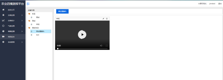 監(jiān)控主頁顯示設(shè)備列表、大屏可視化、地圖展示等菜單信息。顯示土壤墑情、蟲情、氣象監(jiān)測(cè)圖標(biāo)及設(shè)備的運(yùn)行狀態(tài)。
